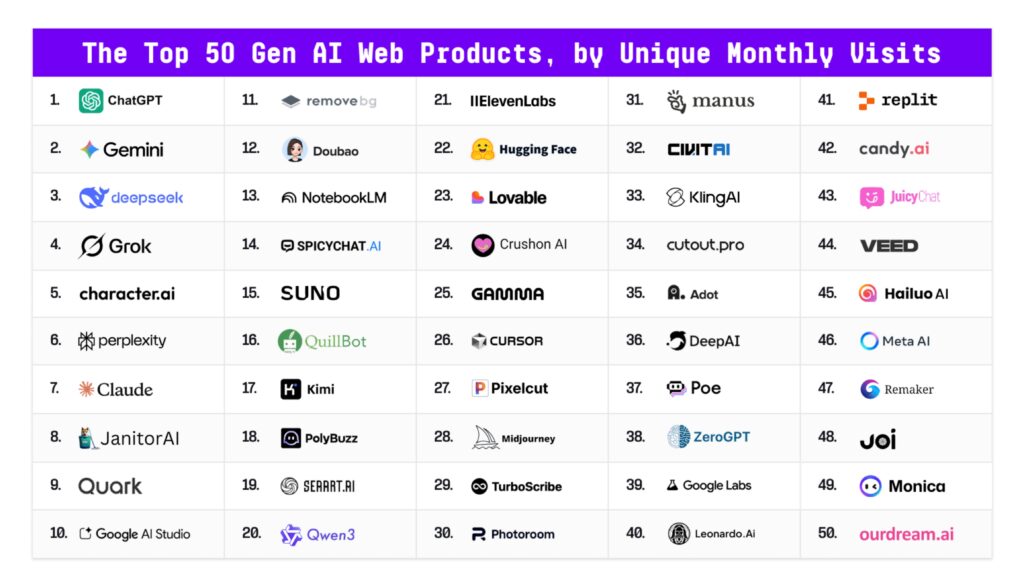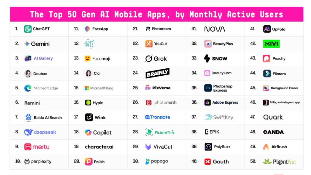 Google debutó de manera contundente con cuatro productos propios en el ranking: Gemini (2.º lugar en web), AI Studio (entre el 7.º y 10.º lugar), NotebookLM (#13) y Google Labs (#39). En el terreno móvil, Gemini se posiciona ya como la segunda aplicación más usada, alcanzando casi el 50 % del volumen de usuarios activos de ChatGPT, un crecimiento que refuerza el papel de Google en la competencia por el liderazgo en IA generativa.